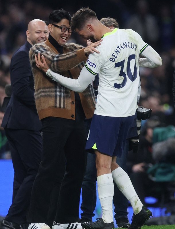 손흥민은 13일(한국시간) 영국 런던의 토트넘 홋스퍼 스타디움에서 열린 2022-2023시즌 잉글랜드 프리미어리그(EPL) 16라운드 토트넘과 리즈의 프리미어리그 홈 경기를 찾아 멀티골로 팀의 승리를 이끈 벤탄쿠르와 미소를 지으며 대화를 나누고 있다.