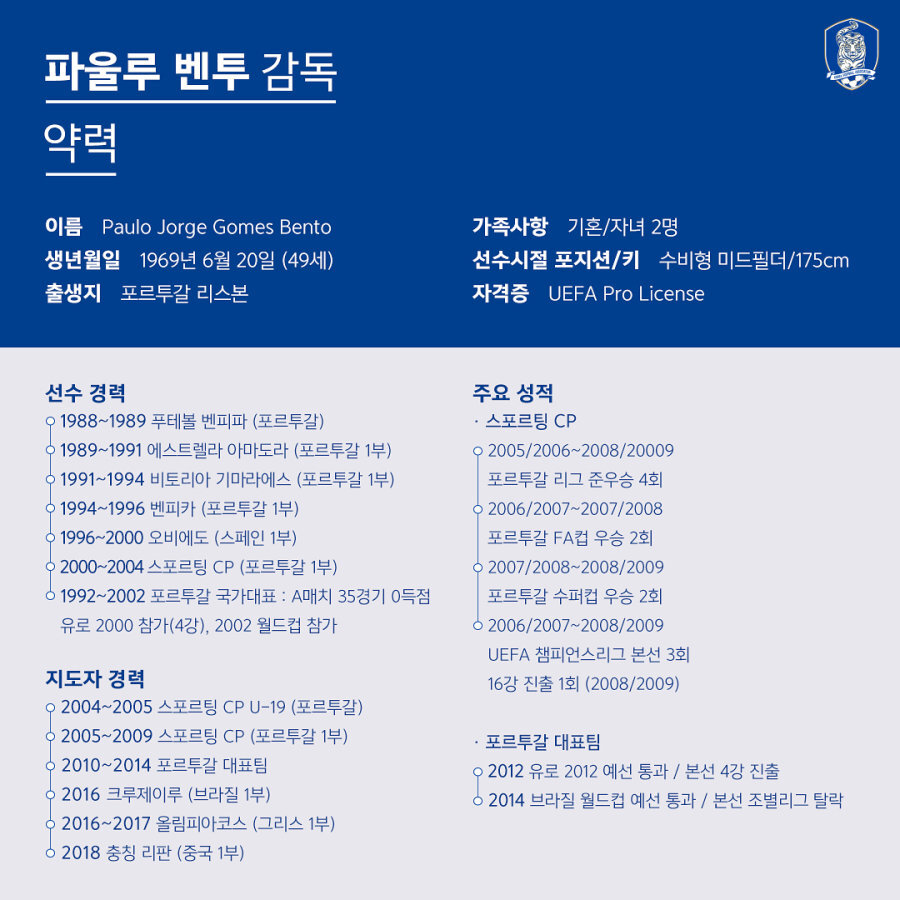 공교롭게도 이 경기는 벤투 감독의 대표팀 마지막 경기가 됐다. 벤투 감독은 2004년 스포르팅 리스본(포르투갈)에서 선수생활을 마무리했다.